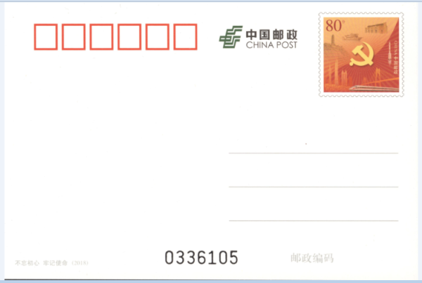 中国邮政定于2018年7月1日发行《不忘初心 牢记使命》普通邮资明信片2枚。详情如下: