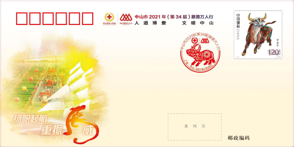 为纪念中山市2021年慈善万人行活动,中山市分公司发行主题纪念封。纪念封张贴《辛丑年》生肖牛票一枚,限量发行3000枚。纪念封以中山市慈善万人行场景为主图,远景为深中通道,整体设计体现了“扬帆起航 重振虎威”的美好愿景,以及“人道博爱 文明中山”万人行活动主题。中山市分公司还为购买纪念封的市民提供加盖万人行宣传纪念戳服务。据了解,慈善万人行活动是中山市一项大型慈善嘉年华活动,至今已举办34届。