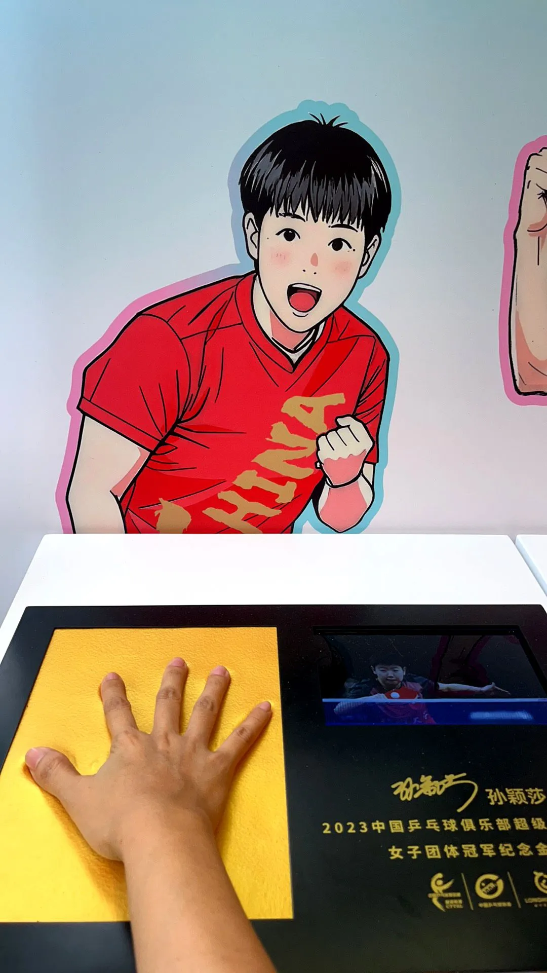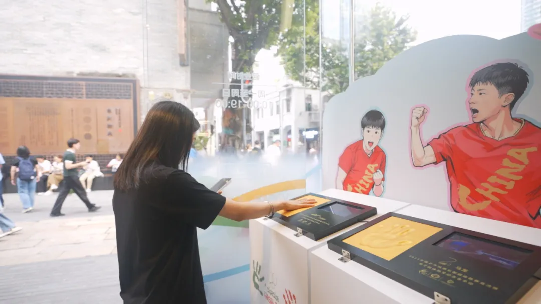 ——沉浸互动,手印打卡乐在其中。现场特别设置孙颖莎、马龙手印展示区,游客可模拟击掌合影,增强参与感与趣味性。