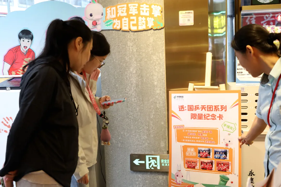 —明效应,签名球拍见证荣耀。邮局内陈列孙颖莎、王楚钦、王曼昱等多位乒乓球世界冠军的签名球拍,吸引众多体育迷驻足,近距离感受国球风采与拼搏精神。