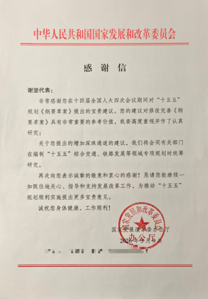 3月9日,国家发展和改革委员会办公厅向全国人大代表、广东省珠海市邮政分公司海岛支局局长兼外伶仃营业所营投员谢坚发来感谢信,就其在全国两会期间为“十五五”规划纲要草案提出的宝贵建议致以诚挚谢意,并指出他的建议对修改完善《纲要草案》具有非常重要的参考价值,国家发改委将会同有关部门在编制“十五五”综合交通、铁路发展等领域专项规划时统筹研究。
