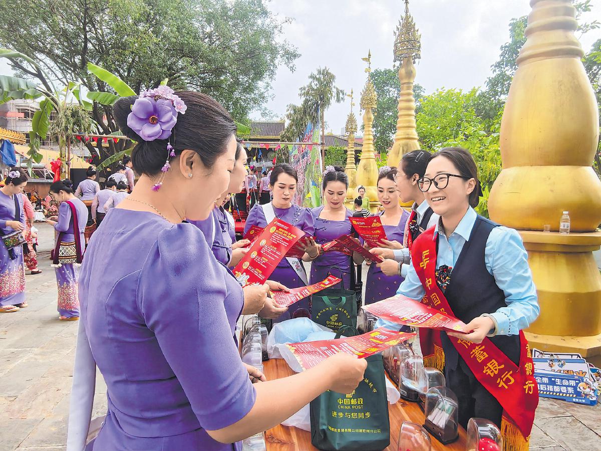 进入4月,云南多地又展开一年一度的泼水节系列活动。连日来,云南省德宏傣族景颇族自治州邮政分公司协同邮储银行德宏州分行紧抓各族群众欢聚的契机,组织宣传小分队深入辖区村寨,将交通安全注意事项、禁毒与反诈知识、金融便民服务送到百姓身边。