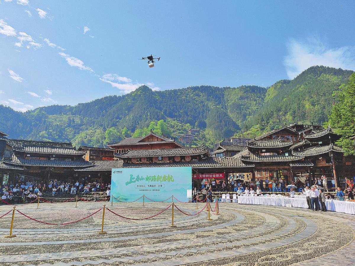 4月10日,贵州省黔东南苗族侗族自治州邮政分公司启动“上春山·邮路新启航——黔茶出山,飞越‘最后一公里’”主题行动,标志着贵州省首条偏远山区无人机邮路开启常态化运营。该邮路采用“固定巡航+阶梯式定点投递”模式,实现高效双向运输:清晨从雷山县西江邮政支局运送包裹、报刊进村;返程则搭载脚尧村出产的茶叶下山,全程仅需30分钟。黔东南州分公司还将在邮乐网为脚尧村开设官方旗舰店,集中展示和销售银球茶、苗族刺绣等产品;策划“跟着无人机逛脚尧”系列直播,以独特视角推介当地风光与产品,助农增收。