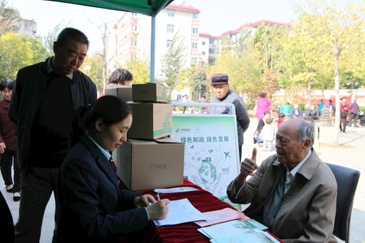 11月2日,河南省郑州市金水区邮政分公司联合河南农业大学社区开展“绿色邮政,绿色发展——绿色邮政在身边”主题宣传活动。活动当天,该分公司借助“关注小环境,共享大健康”免费体检活动,在活动现场设立绿色包装展示台、金融知识咨询台,悬挂条幅,发放宣传页,让更多市民了解邮政绿色发展理念。 □王璐 摄影报道