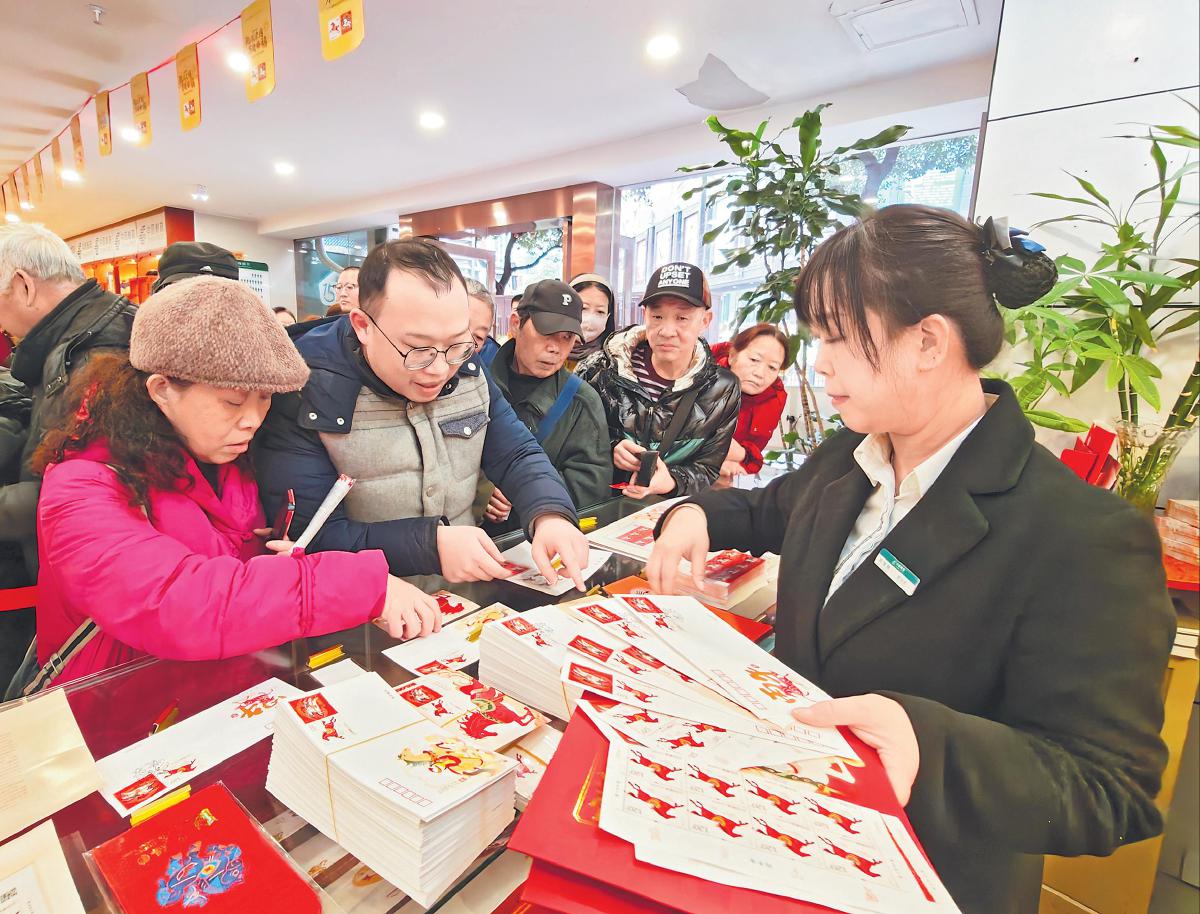1月5日,《丙午年》特种邮票全国发行,以“驰跃宏图、万骏臻福”的文化意象,将传统生肖底蕴与时代活力传遍全国。各地邮政营业网点联动构建生肖文化传播矩阵,让这套承载奋进寓意与吉祥期许的“国家名片”,成为“十五五”开局之际的全国性文化热点。老邮迷品鉴方寸匠心,年轻人追捧文创潮流,掀起全民集藏热潮。图为贵州省贵阳市喷水池邮政营业所工作人员热情地向市民讲解马年生肖邮票的设计理念与印制特色。此外,该营业所还特别准备了开阳马场生肖原地戳等特色纪念邮戳,切实满足广大邮迷需求。