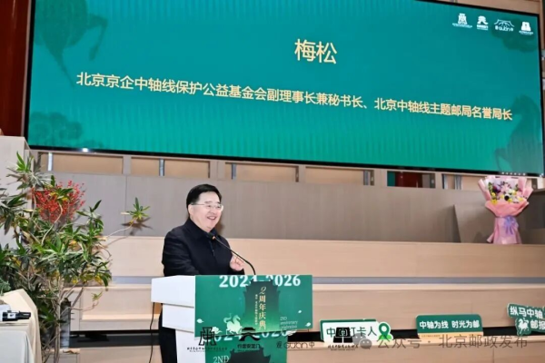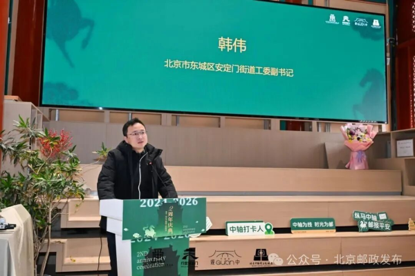 在领导嘉宾致辞环节,北京京企中轴线保护公益基金会副理事长兼秘书长、北京中轴线主题邮局名誉局长梅松,及东城区安定门街道工委副书记韩伟,分别就中轴线文化保护、公共文化空间建设及邮政文化创新等方面发表致辞。