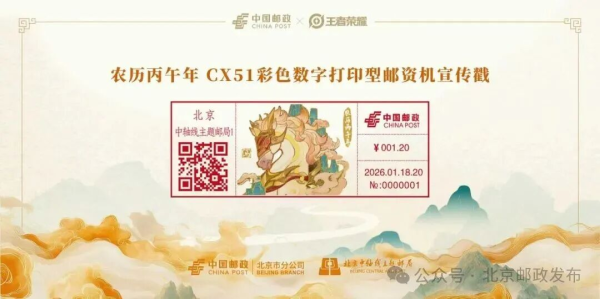 该邮资机彩戳作为马年新春的重要文化印记,将在北京中轴线主题邮局正式投入使用,为市民与游客寄送新春祝福、记录城市时间提供独特载体。第一次实现TS71彩色粘贴型邮资机宣传戳和CX51彩色打印型邮资机宣传戳同一题材,同一元素,同框出现在生肖极限纪念封上。