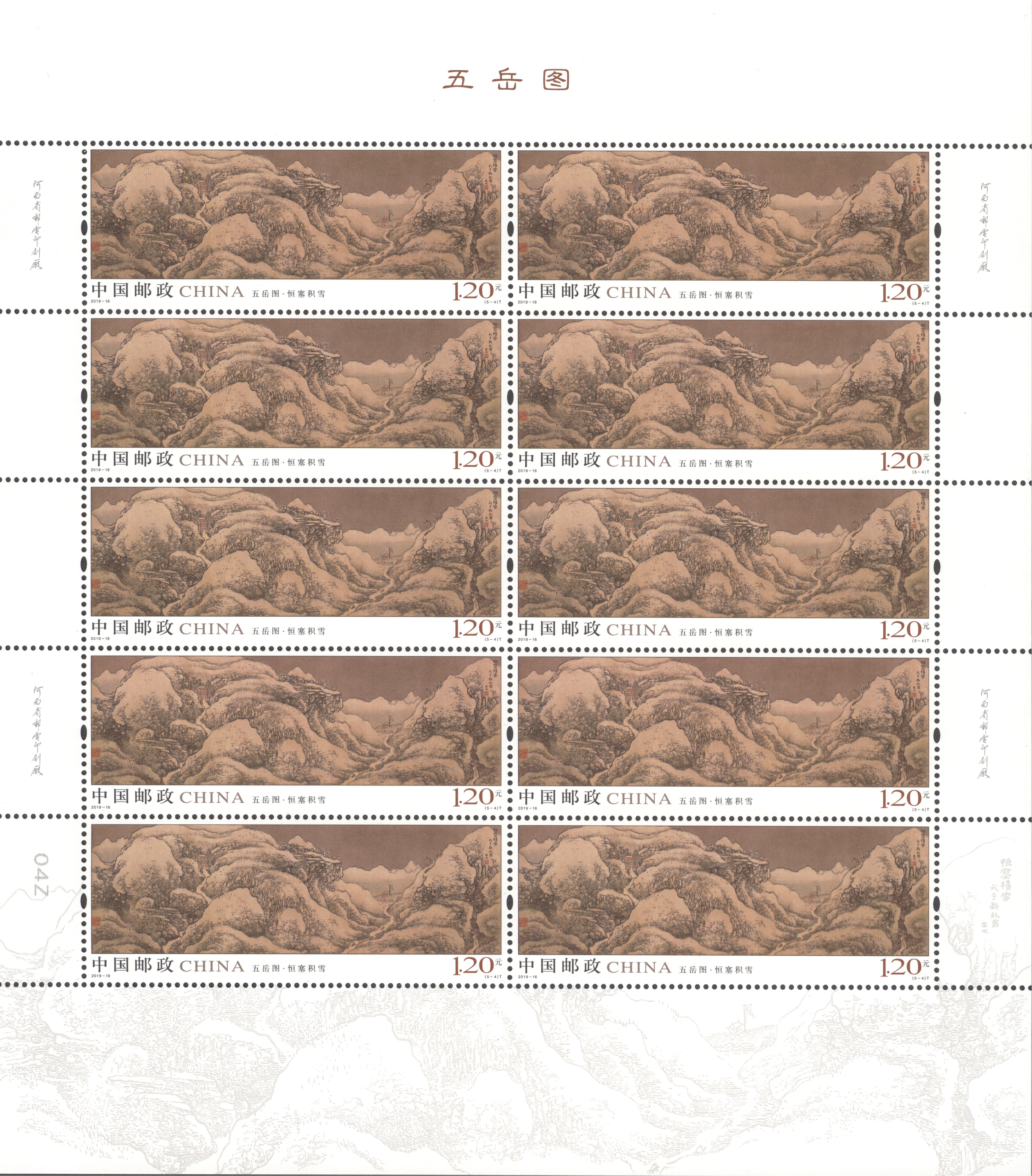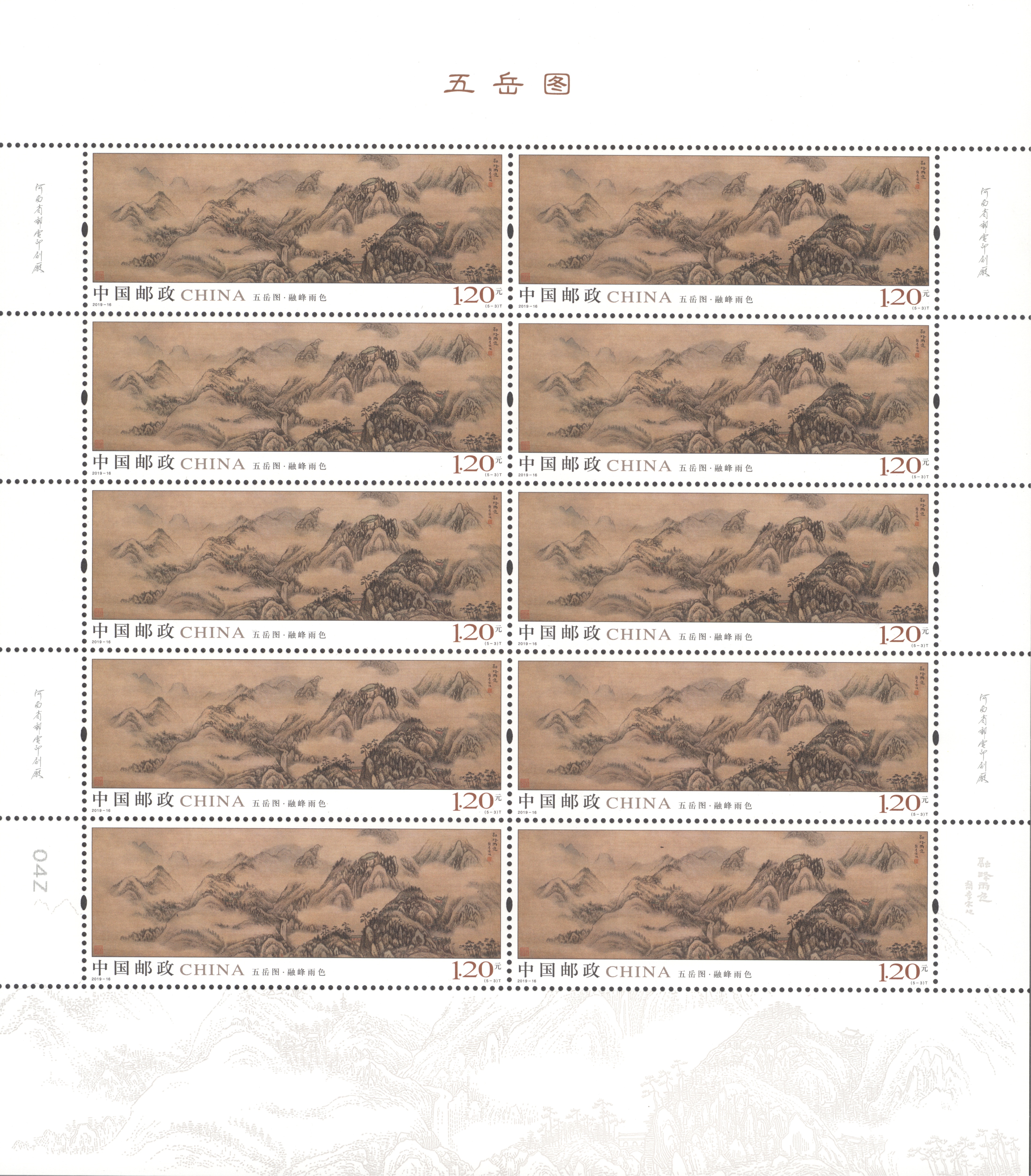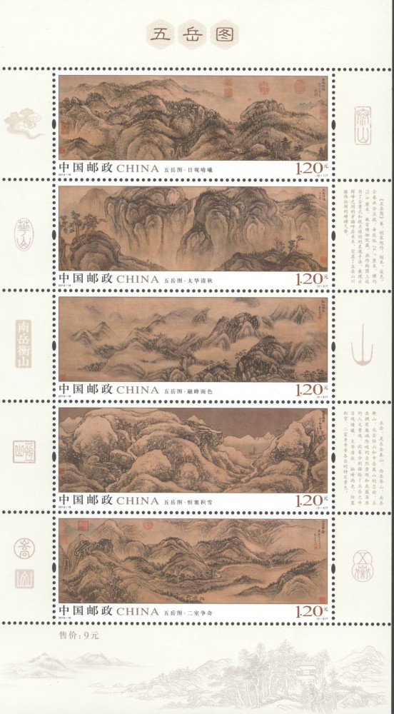 中国邮政定于2019年8月3日发行《五岳图》特种邮票1套5枚,小全张1枚。详情如下: