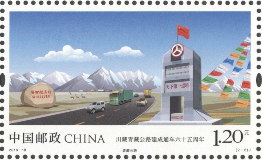中国邮政定于2019年8月10日发行《川藏青藏公路建成通车六十五周年》纪念邮票1套2枚,邮票图案名称分别为:川藏公路、青藏公路,全套邮票面值为2元。