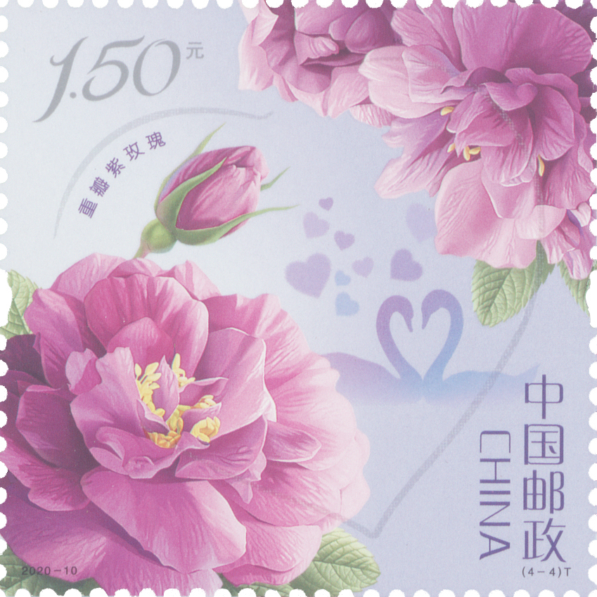 中国邮政定于2020年5月20日发行《玫瑰》特种邮票一套4枚。邮票图案名称分别为:玫瑰、单瓣粉玫瑰、重瓣白玫瑰 、重瓣紫玫瑰,全套邮票面值为5.40元。