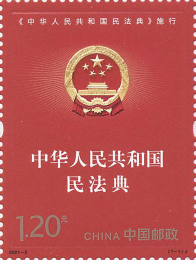 中国邮政定于2021年1月1日发行《<中华人民共和国民法典>施行》纪念邮票1套1枚。详情如下: